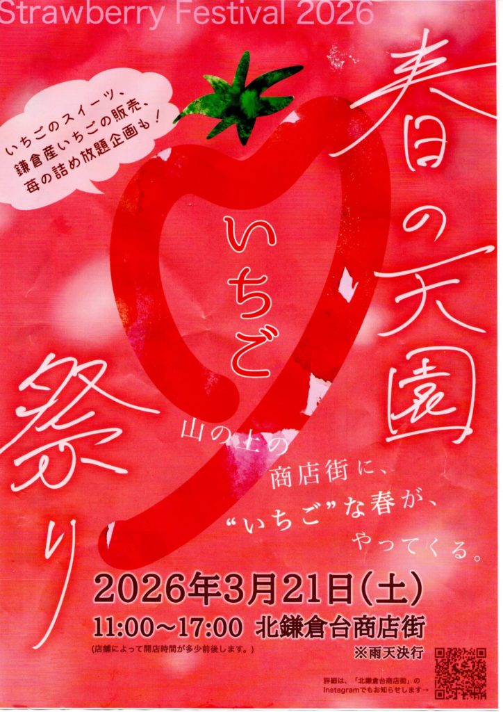 3月21日、北鎌倉台商店街で「いちご祭り」が開催されました。商店街には屋台が並び、いちごを使ったスイーツや関連商品が所狭しと並び、春の香りが漂っていました。公民館では小学生と大人によるジャズコンサートも開かれ、会場は終始にぎやかな雰囲気に包まれました。